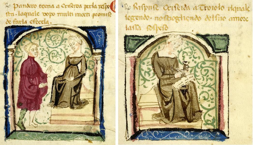 New York, Pierpont Morgan Library, M 371, f. 17v. Il copista del manoscritto, datato ottobre 1414, è Pace di Giuliano da Olibano. Pandaro parla nuovamente con Criseide per ottenere una risposta; Criseide scrive una lettera.