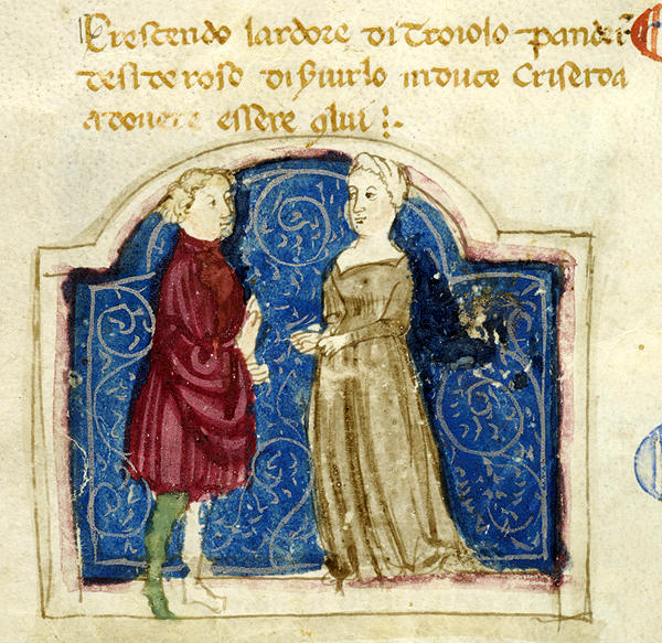 New York, Pierpont Morgan Library, M 371, f. 18v. Il copista del manoscritto, datato ottobre 1414, è Pace di Giuliano da Olibano. Criseide consegna a Pandaro la lettera per Troiolo.