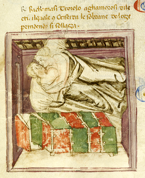 New York, Pierpont Morgan Library, M 371, f. 21r. Il copista del manoscritto, datato ottobre 1414, è Pace di Giuliano da Olibano. Troiolo e Criseide giacciono insieme.