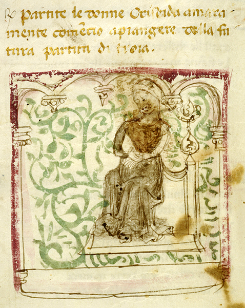 New York, Pierpont Morgan Library, M 371, f. 32v. Il copista del manoscritto, datato ottobre 1414, è Pace di Giuliano da Olibano. Criseide siede in solitudine in preda alla malinconia.