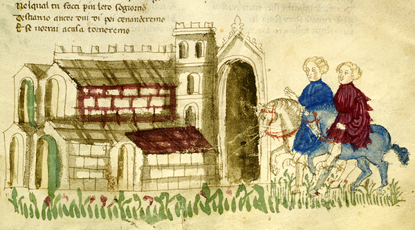 New York, Pierpont Morgan Library, M 371, f. 42r. Il copista del manoscritto, datato ottobre 1414, è Pace di Giuliano da Olibano. Troiolo e Pandaro ritornano a Troia a cavallo.