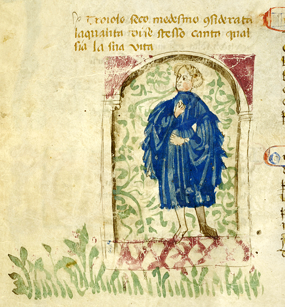 New York, Pierpont Morgan Library, M 371, f. 43r. Il copista del manoscritto, datato ottobre 1414, è Pace di Giuliano da Olibano. Troiolo sta da solo, cantando tra sé.