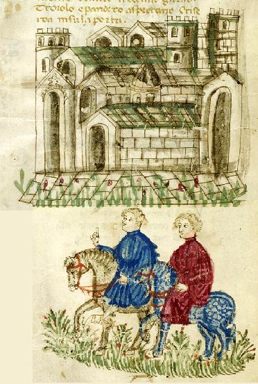 New York, Pierpont Morgan Library, M 371, f. 46v. Il copista del manoscritto, datato ottobre 1414, è Pace di Giuliano da Olibano. Troiolo e Pandaro a cavallo attendono Criseide fuori le mura di Troia.