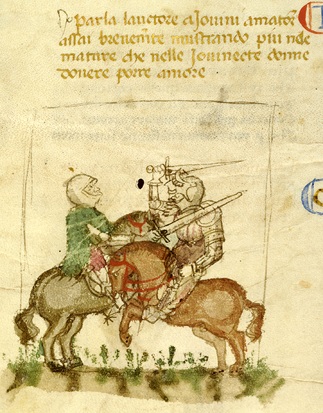New York, Pierpont Morgan Library, M 371, f. 56r. Il copista del manoscritto, datato ottobre 1414, è Pace di Giuliano da Olibano. Due cavalieri si sfidano a duello.