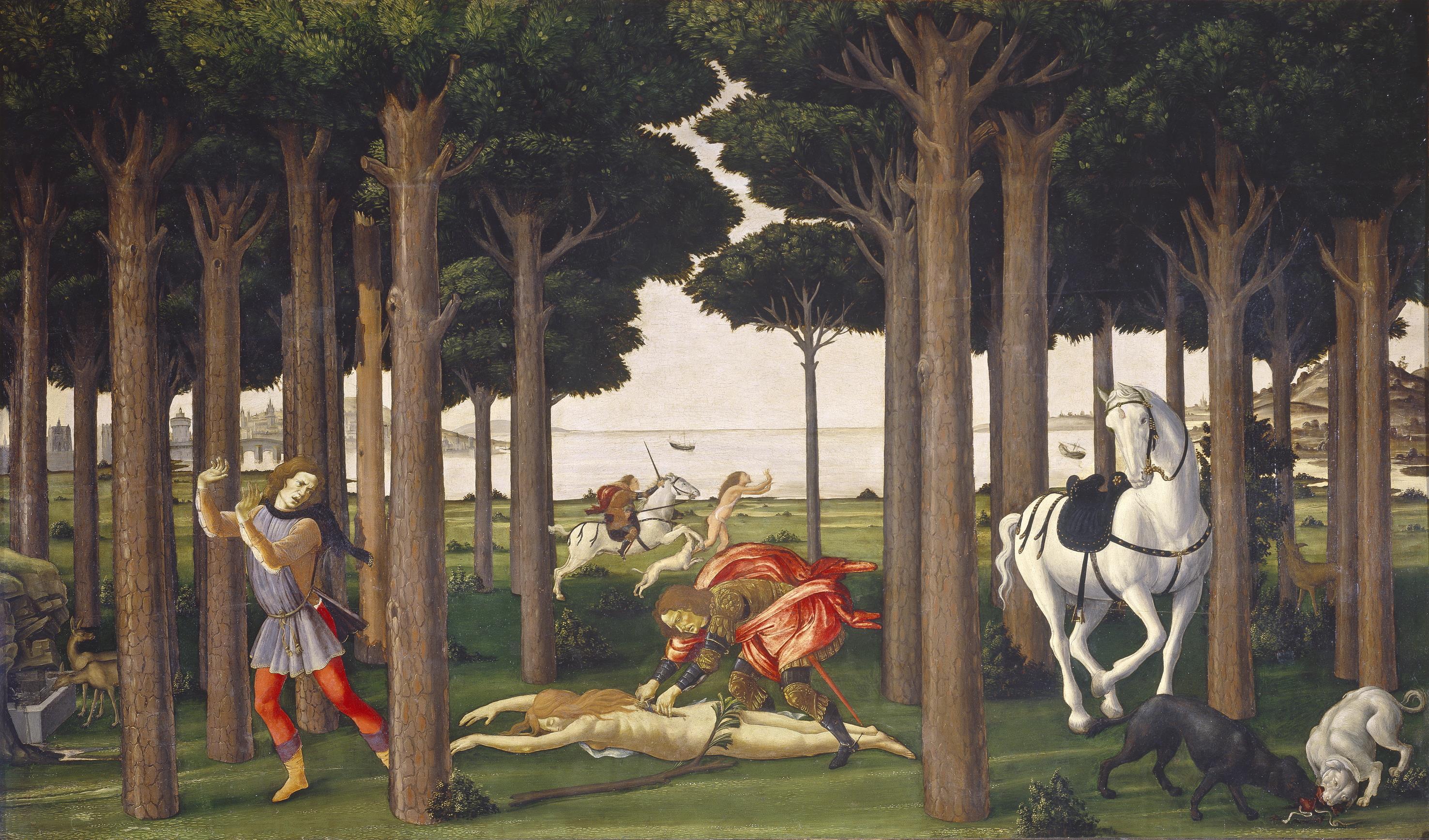 Alessandro Filipepi (Sandro Botticelli) e Bartolomeo di Giovanni (1483), Nastagio degli Onesti fugge alla vista del cavaliere che mutila il corpo della fanciulla