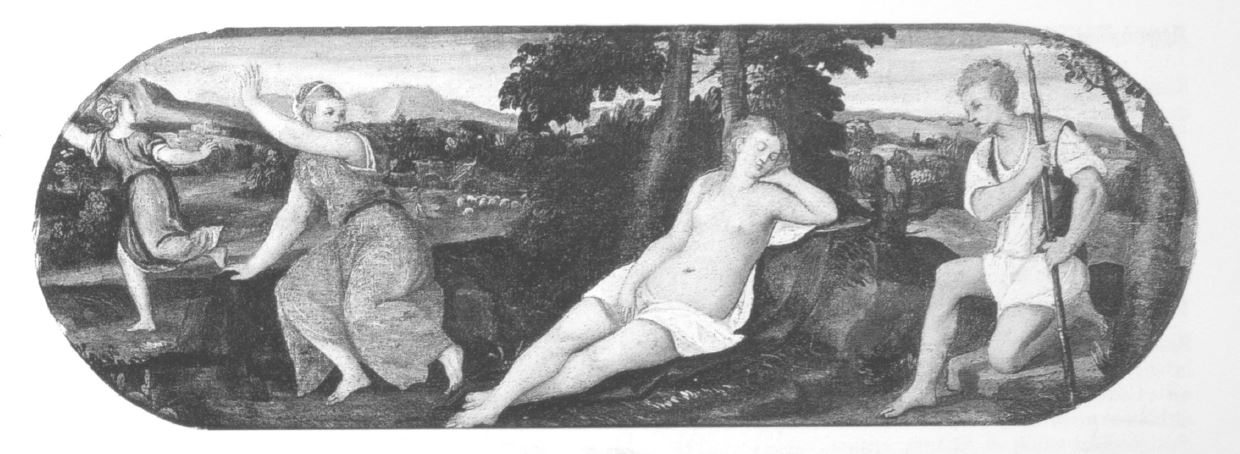 Collezione privata. Cimone osserva Efigenia addormentata in un giardino, mentre due ancelle fuggono terrorizzate.