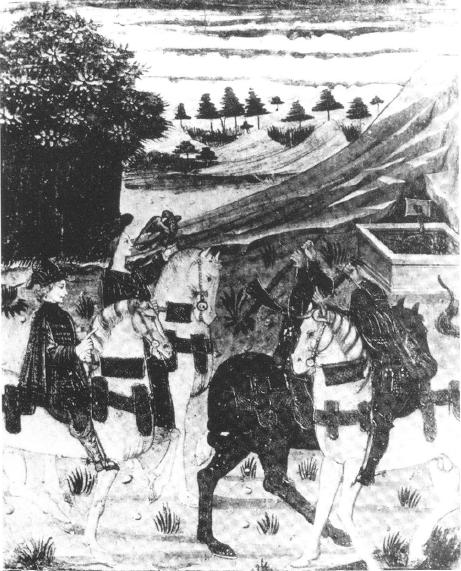 Ubicazione ignota. Arcita e Palemone si sfidano a duello osservati da Teseo ed Emilia, la quale regge un falcone sul pugno.