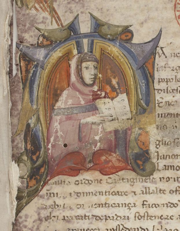 Parigi, Bibliothèque Nationale de France, It. 481, f. 1r. Mezzobusto dell'autore Giovanni Boccaccio con un libro aperto tra le mani, all'interno dell'iniziale figurata M(ancate).