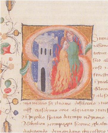Venezia, Biblioteca Nazionale Marciana, It. X. 31, f. 106r. Il manoscritto è datato 3 febbraio 1429 [1430]. Florio e Biancifiore stanno tra le fiamme dinanzi la torre, all'interno dell'iniziale istoriata S(tando).