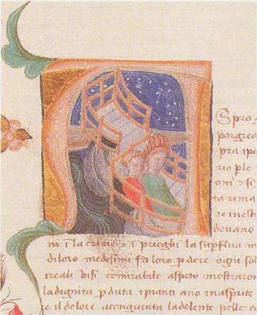 Venezia, Biblioteca Nazionale Marciana, It. X. 31, f. 111r. Il manoscritto è datato 3 febbraio 1429 [1430]. Florio e Biancifiore sul vascello, all'interno dell'iniziale istoriata A(spro).
