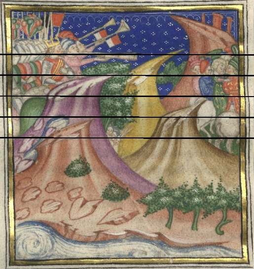 Kassel, Universitätsbibliothek Kassel, Landesbibliothek und Murhardsche Bibliothek der Stadt Kassel, 2° poet. et roman. 3, f. 8v. L'esercito di Re Felice, composto di cavalieri, fanti e trombettieri, giunge in vista della compagnia di Lelio e Giulia.