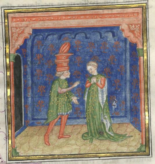 Kassel, Universitätsbibliothek Kassel, Landesbibliothek und Murhardsche Bibliothek der Stadt Kassel, 2° poet. et roman. 3, f. 31v. Florio e Biancifiore a colloquio in un interno.