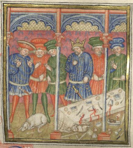 Miniatore lombardo (1450 c.), I convitati osservano il cane avvelenato