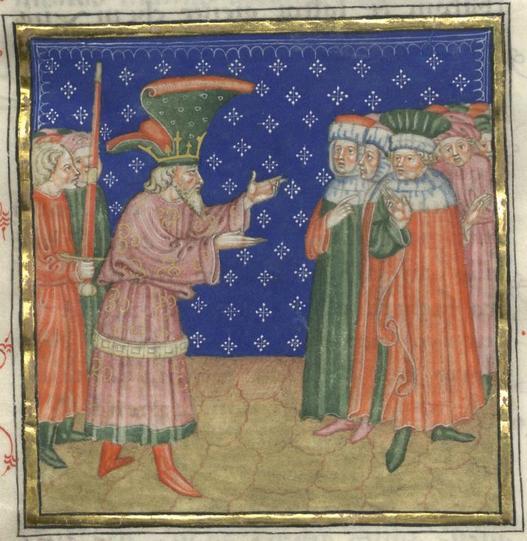 Miniatore lombardo (1450 c.), Il re esorta i giudici a condannare Biancifiore