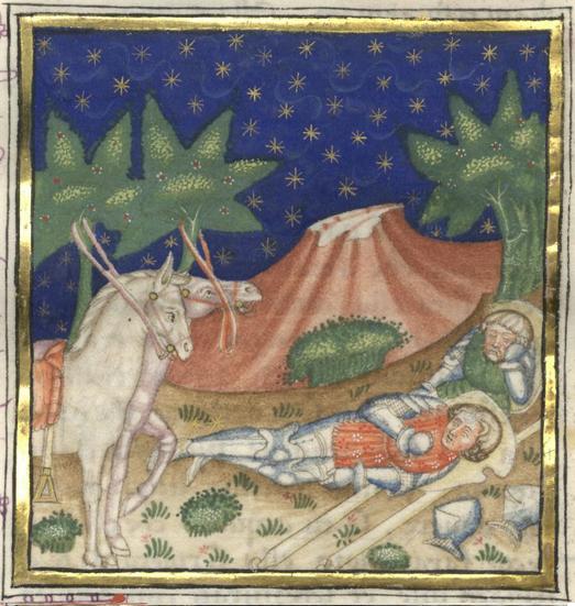 Kassel, Universitätsbibliothek Kassel, Landesbibliothek und Murhardsche Bibliothek der Stadt Kassel, 2° poet. et roman. 3, f. 53r. Florio e Ascalion si riposano durante il viaggio.