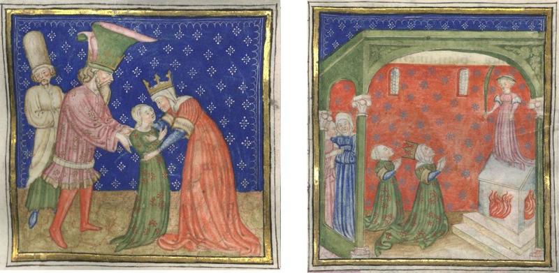 Kassel, Universitätsbibliothek Kassel, Landesbibliothek und Murhardsche Bibliothek der Stadt Kassel, 2° poet. et roman. 3, f. 62r. La carta presenta due miniature: il re riporta Biancifiore dalla regina, la quale accoglie la fanciulla a braccia aperte; la regina e Biancifiore pregano dinanzi all'altare di una dea.