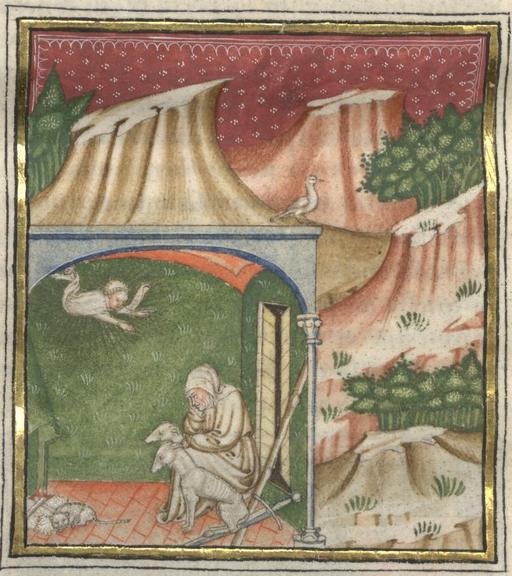 Kassel, Universitätsbibliothek Kassel, Landesbibliothek und Murhardsche Bibliothek der Stadt Kassel, 2° poet. et roman. 3, f. 80v. La dea Diana visita la Gelosia, rappresentata come una vecchia seduta in una capanna tra i monti in compagnia di un gatto e due cani ossuti.