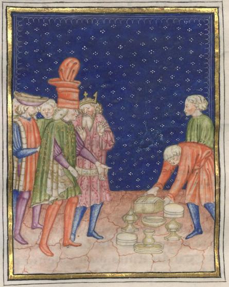 Miniatore lombardo (1450 c.), Il re consegna a Florio i tesori dei mercanti