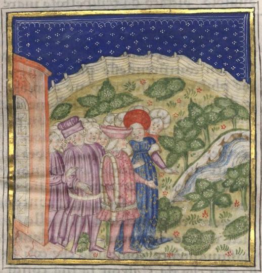 Kassel, Universitätsbibliothek Kassel, Landesbibliothek und Murhardsche Bibliothek der Stadt Kassel, 2° poet. et roman. 3, f. 111v. Fiammetta guida il gruppo di giovani attraverso il giardino verso una fonte.
