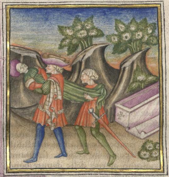 Kassel, Universitätsbibliothek Kassel, Landesbibliothek und Murhardsche Bibliothek der Stadt Kassel, 2° poet. et roman. 3, f. 132v. È raffigurata la tredicesima questione d'amore: un cavaliere e il suo scudiero traggono una donna morta dalla tomba.