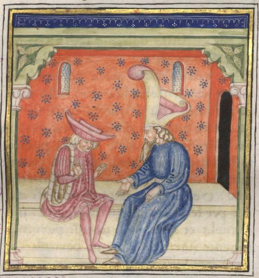 Kassel, Universitätsbibliothek Kassel, Landesbibliothek und Murhardsche Bibliothek der Stadt Kassel, 2° poet. et roman. 3, f. 146r. Sadoc e Filocolo siedono a colloquio, l'arabo chiedendo al giovane cosa desideri in dono.