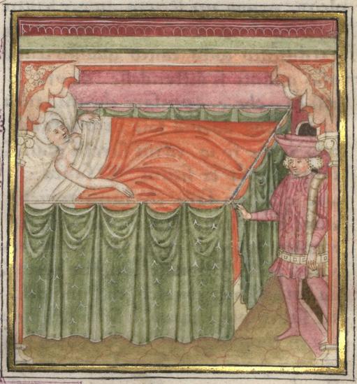 Kassel, Universitätsbibliothek Kassel, Landesbibliothek und Murhardsche Bibliothek der Stadt Kassel, 2° poet. et roman. 3, f. 151r. Filocolo apre la cortina del letto in cui giace Biancifiore.