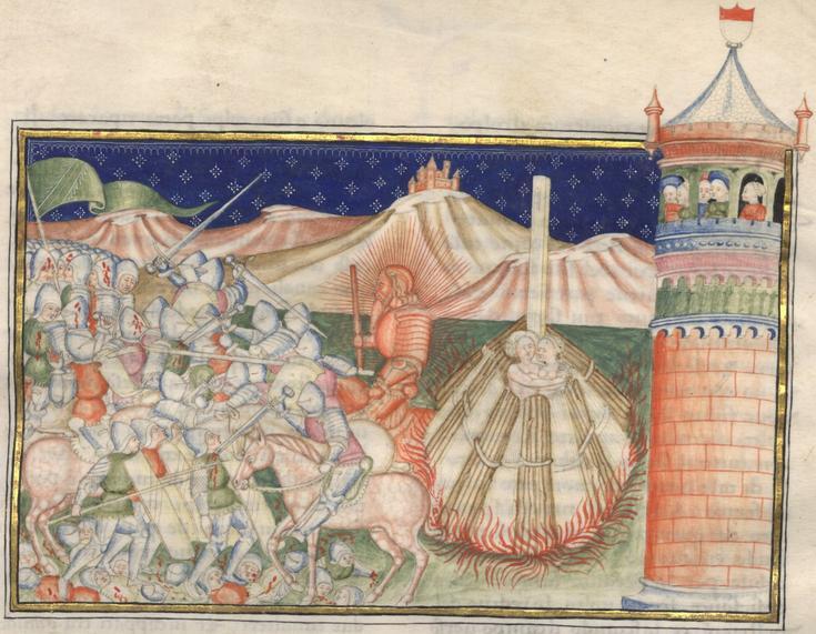 Kassel, Universitätsbibliothek Kassel, Landesbibliothek und Murhardsche Bibliothek der Stadt Kassel, 2° poet. et roman. 3, f. 160r. Gli amici di Filocolo, aiutati dal dio Marte, danno battaglia alle guardie dell'ammiraglio di Alessandria.