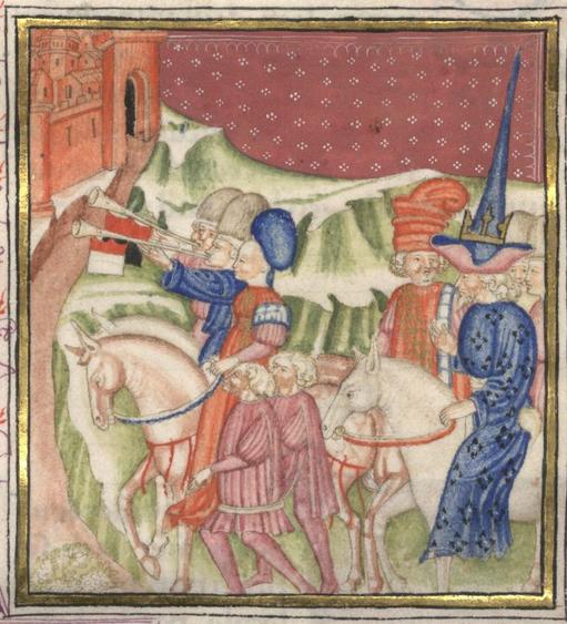 Kassel, Universitätsbibliothek Kassel, Landesbibliothek und Murhardsche Bibliothek der Stadt Kassel, 2° poet. et roman. 3, f. 167r. Parmenione e Alcipiades scortano a piedi Biancifiore alla città, seguiti da Filocolo, l'ammiraglio e altri personaggi.