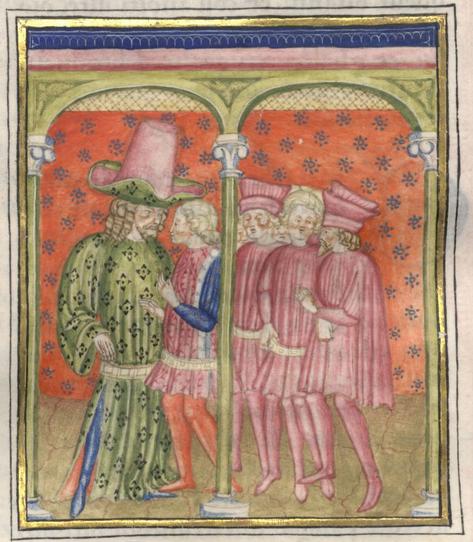 Kassel, Universitätsbibliothek Kassel, Landesbibliothek und Murhardsche Bibliothek der Stadt Kassel, 2° poet. et roman. 3, f. 167v. Filocolo annuncia all'ammiraglio ed ai suoi compagni la sua intenzione di ritornare in patria.