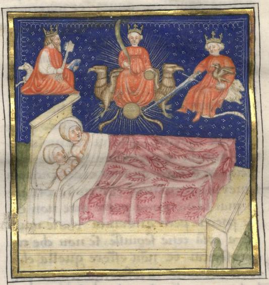 Kassel, Universitätsbibliothek Kassel, Landesbibliothek und Murhardsche Bibliothek der Stadt Kassel, 2° poet. et roman. 3, f. 185v. Addormentata accanto a Filocolo, Biancifiore sogna tre figure incoronate: al centro una donna vestita di rosso e seduta su due grifoni, con un globo e una palma tra le mani e un globo ai propri piedi, ai lati un vecchio incoronato con due chiavi seduto su un agnello e un giovane seduto su un leone con un'aquila e una spada tra le mani.