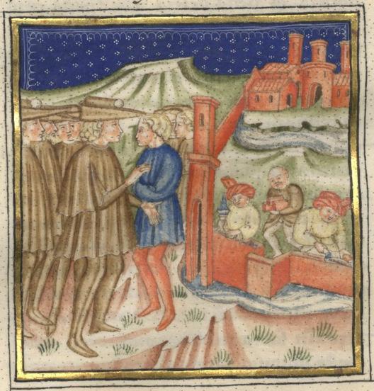 Kassel, Universitätsbibliothek Kassel, Landesbibliothek und Murhardsche Bibliothek der Stadt Kassel, 2° poet. et roman. 3, f. 186v. Filocolo, vestito come i suoi compagni da pellegrino con la conchiglia di San Giacomo sul cappello, congedandosi incarica Caleon di ultimare la costruzione della città.