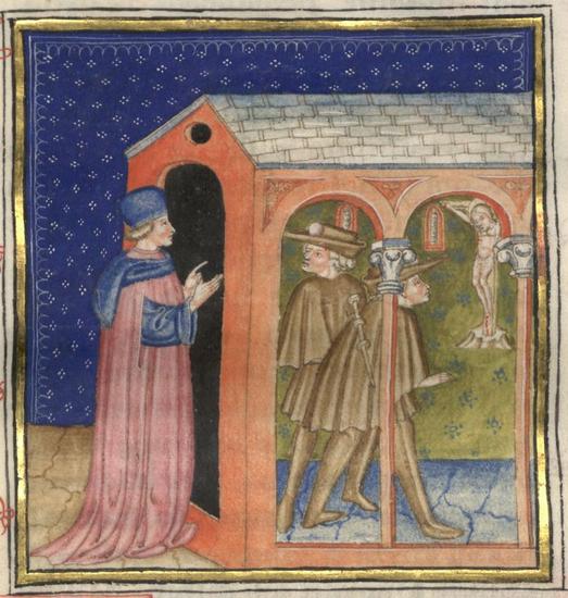 Kassel, Universitätsbibliothek Kassel, Landesbibliothek und Murhardsche Bibliothek der Stadt Kassel, 2° poet. et roman. 3, f. 188v. Ilario entra nella chiesa dove Filocolo e un suo compagno sono in adorazione dinanzi al crocifisso.