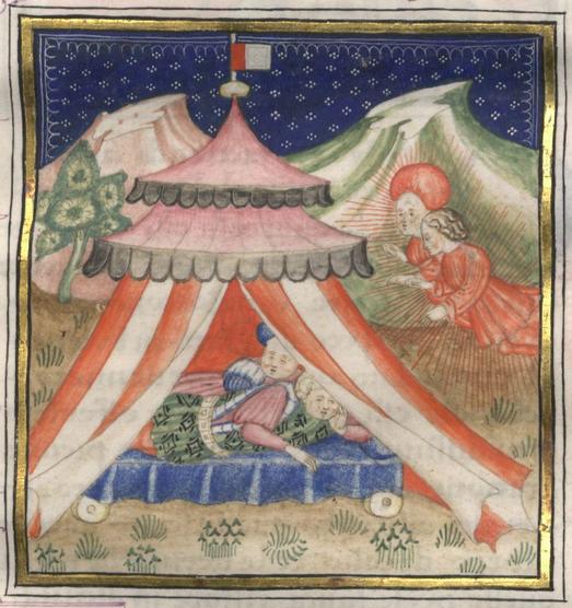 Kassel, Universitätsbibliothek Kassel, Landesbibliothek und Murhardsche Bibliothek der Stadt Kassel, 2° poet. et roman. 3, f. 206r. Biancifiore, dormendo accanto a Florio sotto una tenda, vede in sogno i genitori Lelio e Giulia.