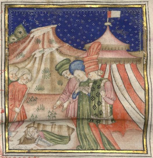 Kassel, Universitätsbibliothek Kassel, Landesbibliothek und Murhardsche Bibliothek der Stadt Kassel, 2° poet. et roman. 3, f. 206v. Florio e Biancifiore scoprono il punto dove era sotterrato il corpo di Lelio.