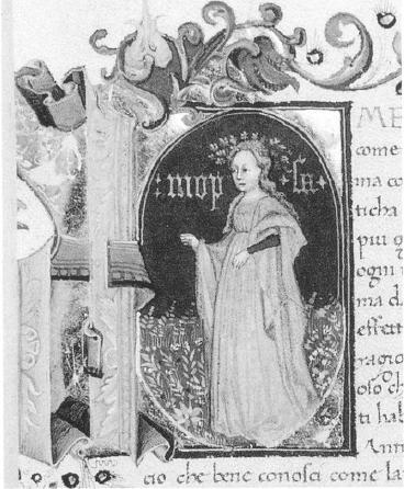 Londra, British Library, Add. 10299, f. 33r. Il copista del manoscritto è stato identificato con Michele Salvatico. La ninfa Mopsa, all'interno dell'iniziale figurata A(meto).