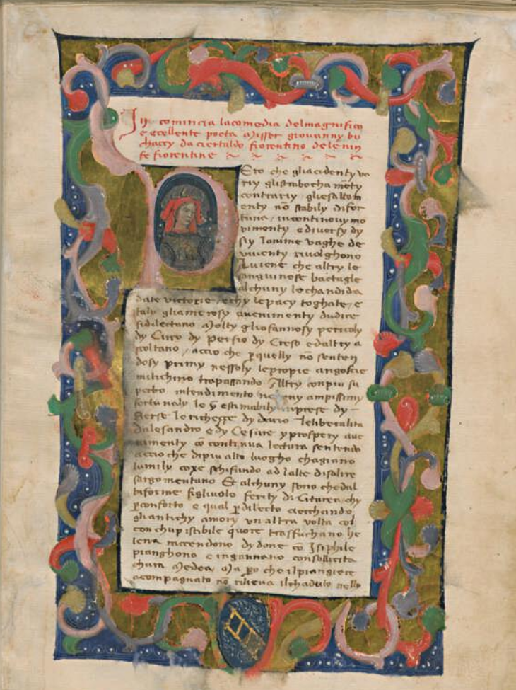Firenze, Biblioteca Medicea Laurenziana, Plut. 90 sup. 102, f. 1r. Il copista del manoscritto, datato aprile 1417, è Ghinozzo Allegretti. Figura di giovane uomo a mezzobusto (Ameto?), all'interno dell'iniziale figurata P(erò).