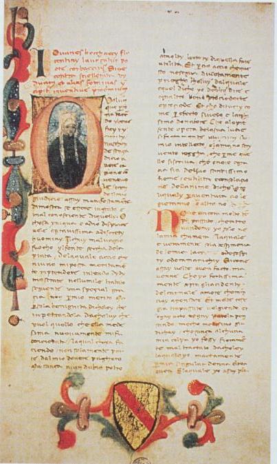 Firenze, Biblioteca Medicea Laurenziana, Plut. 90 sup. 94, f. 56r. Busto della vedova, all'interno dell'iniziale figurata Q(ualunque).
