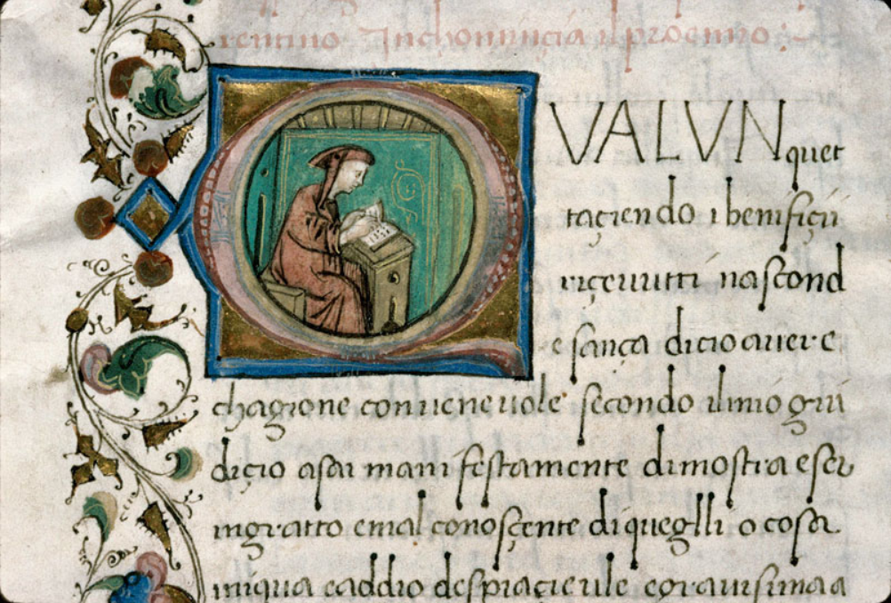 Aix-en-Provence, Bibliothèque Municipale Méjanes, 181, f. 1r. L'autore Giovanni Boccaccio è raffigurato in cattedra mentre sfoglia un libro, all'interno dell'iniziale figurata Q(ualunque).