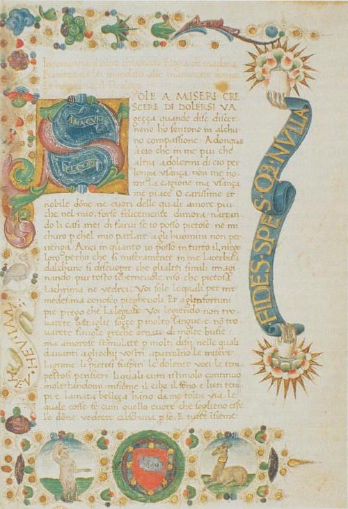 Firenze, Biblioteca Medicea Laurenziana, Ashburnham 1257, f. 1r. Fregio decorativo con due manicule che reggono un cartiglio recante la scritta "Fides Spesque nulla"; nel margine inferiore, ai lati di uno stemma non identificato, sono presenti due medaglioni raffiguranti rispettivamente un putto nudo ed una cerva con un collare dorato.