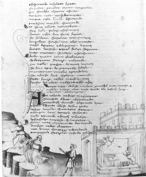 Firenze, Biblioteca Nazionale Centrale, B. R. 47, f. 87v. Africo insegue due ninfe che corrono verso un pendio; Africo viene trafitto da una freccia di Cupido mentre dorme nel suo letto.