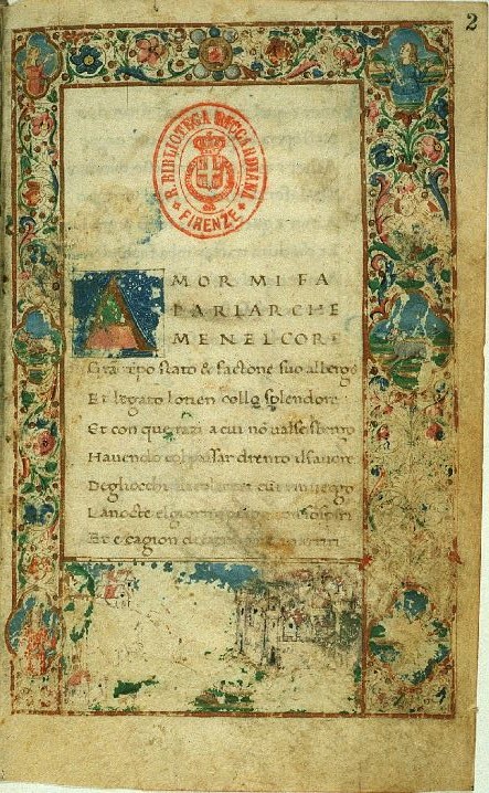 Firenze, Biblioteca Riccardiana, Ricc. 1503, f. 2r. Il copista del manoscritto, datato 1482, è Nicola Mangona. All'interno della cornice decorativa sono presenti sei quadrilobi, raffiguranti rispettivamente Mensola, Africo, Diana, tre animali; nel margine inferiore è rappresentata una veduta della valle dell'Arno e della città di Firenze, estremamente rovinata e quasi illeggibile.