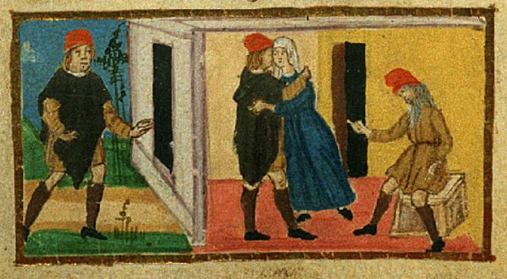 Firenze, Biblioteca Riccardiana, Ricc. 1503, f. 20v. Il copista del manoscritto, datato 1482, è Nicola Mangona. Africo si reca nella casa dei genitori e viene accolto da Alimena con un abbraccio.