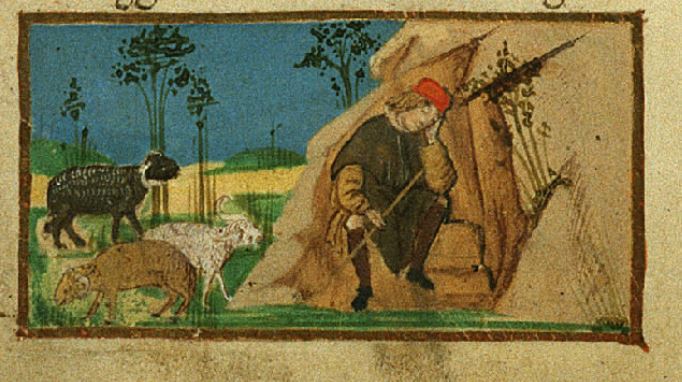 Firenze, Biblioteca Riccardiana, Ricc. 1503, f. 44v. Il copista del manoscritto, datato 1482, è Nicola Mangona. Africo siede accanto al gregge di pecore presso una fonte, in preda alla malinconia.