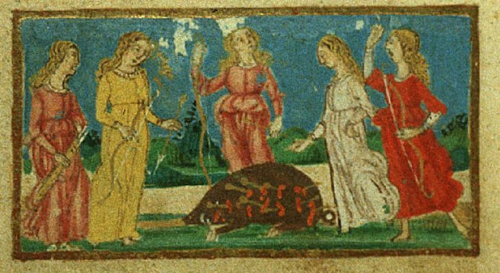 Firenze, Biblioteca Riccardiana, Ricc. 1503, f. 56v. Il copista del manoscritto, datato 1482, è Nicola Mangona. Africo uccide un cinghiale durante la caccia con le ninfe.