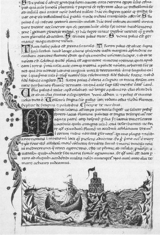 Copenaghen, Det Kongelige Bibliotek, GKS 2092 4°, f. 108r. Il manoscritto è datato 10 febbraio 1401. Nel bas-de-page è raffigurata una nave veleggiare verso una torre fortificata; sulla destra una barca più piccola si dirige verso un'isoletta.