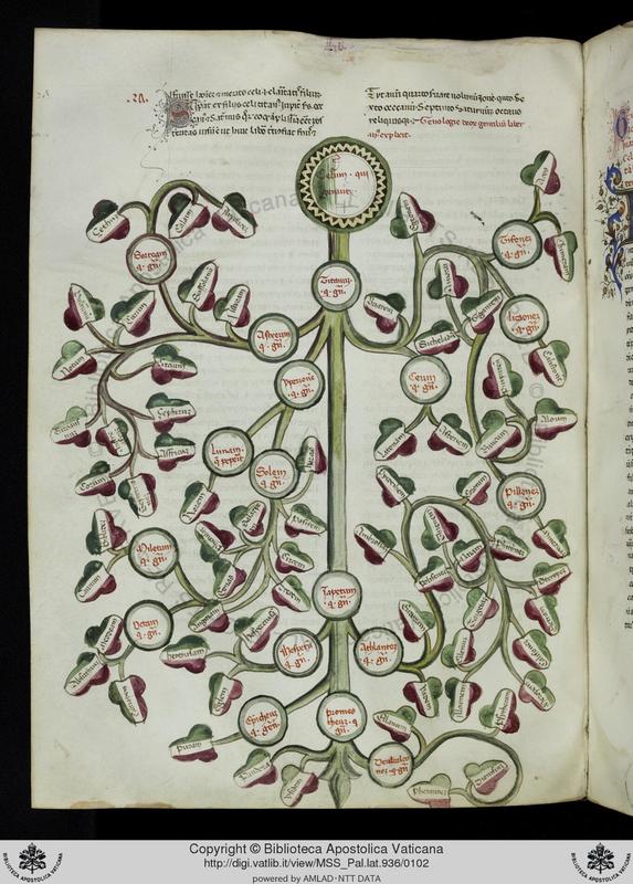Città del Vaticano, BAV, Pal. lat. 936, f. 48v. Albero genealogico di Celo e Titano.