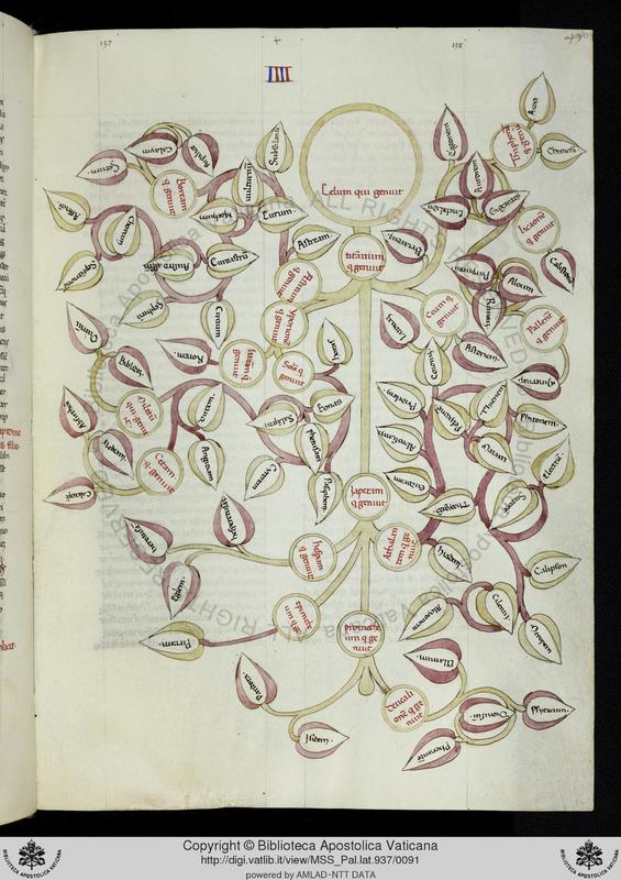 Città del Vaticano, BAV, Pal. lat. 937, f. 43r. Albero genealogico di Celo e Titano.