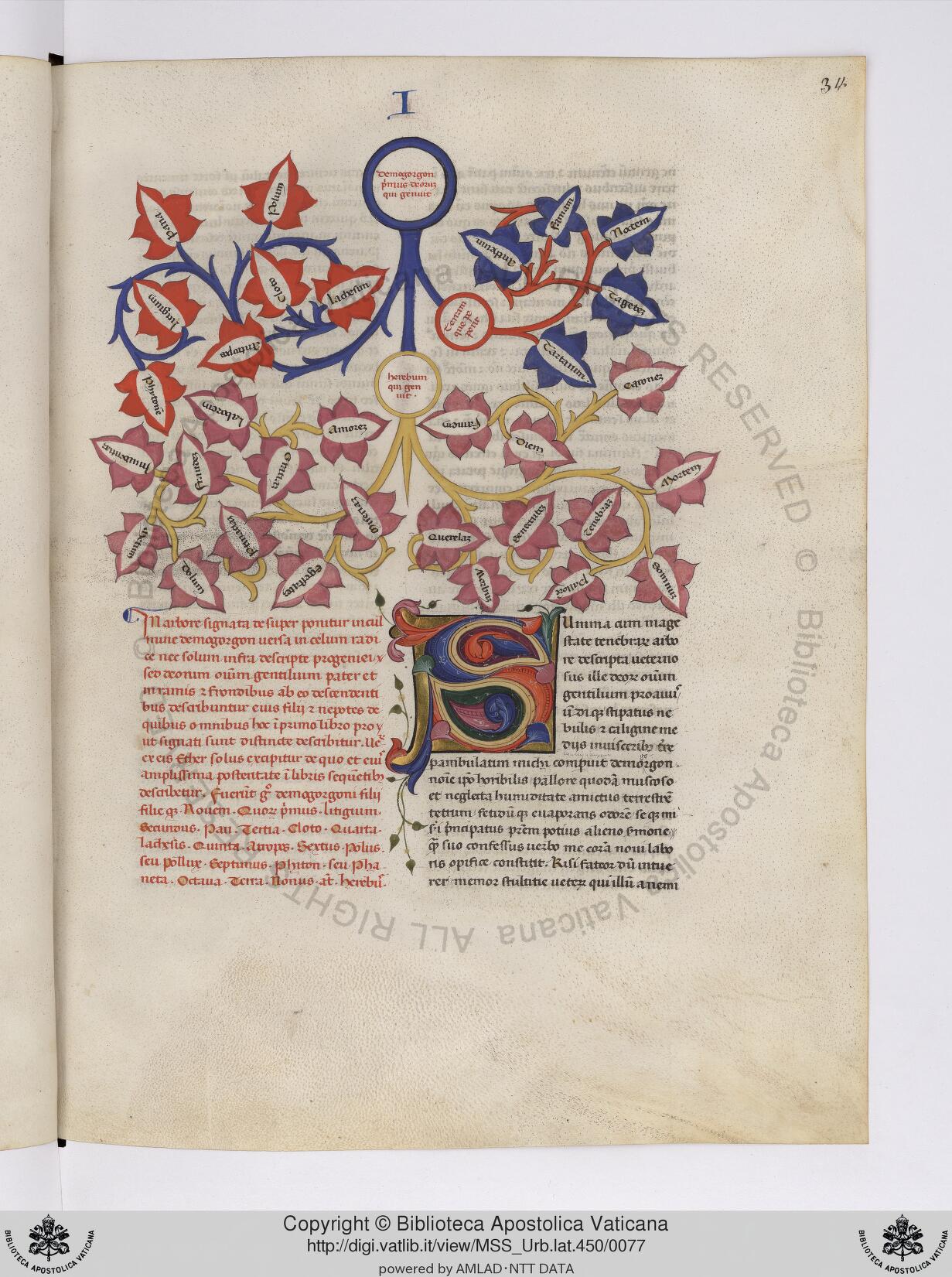 Città del Vaticano, BAV, Urb. lat. 450, f. 34r. Albero genealogico di Demogorgone.