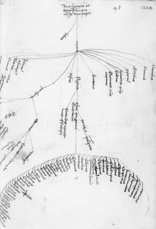 Parigi, Bibliothèque Nationale de France, Lat. 14716, f. 210r. Il copista del manoscritto è Gérard Martel. Albero genealogico di Giunone.