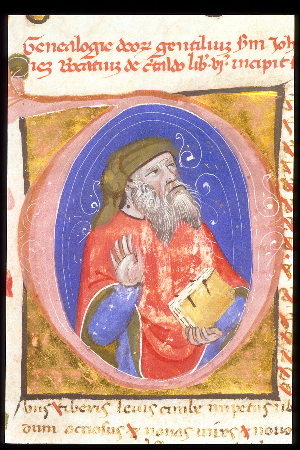 Londra, British Library, Egerton 1865, f. 72v. Il manoscritto è datato 23 giugno 1388. Un uomo con la barba a mezzobusto vestito di rosso con un libro, all'interno dell'iniziale figurata D(efecerat).